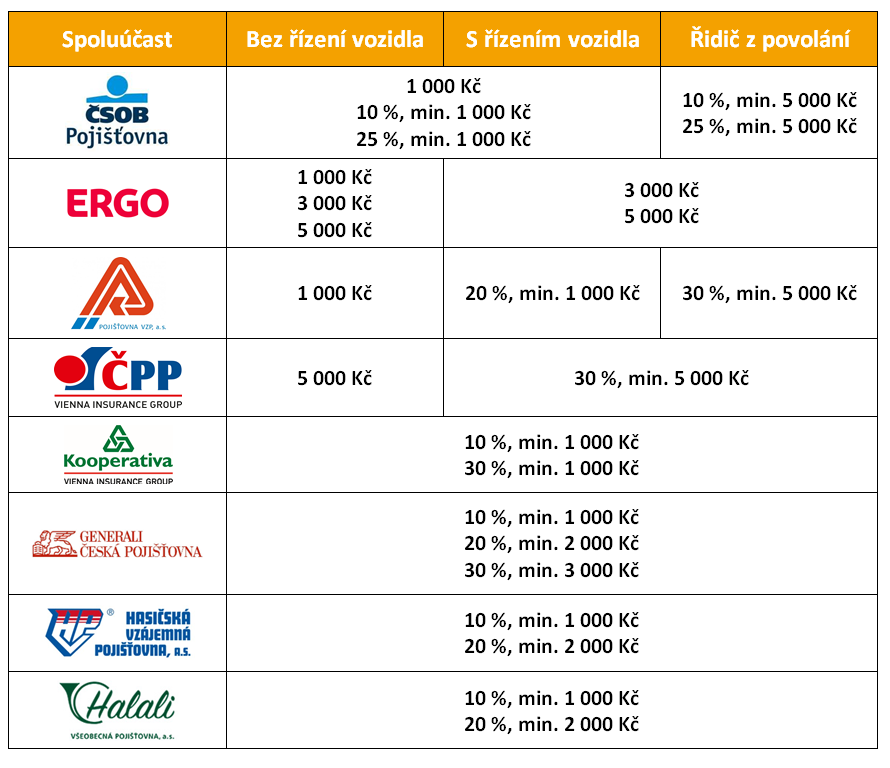 Dalším faktorem, který významně ovlivňuje cenu pojištění, je spoluúčast. Spoluúčast je odečítána od pojistného plnění u všech pojišťoven, které pojištění odpovědnosti zaměstnance z výkonu povolání samostatně jednávají. V tabulce jsou uvedeny spoluúčasti, které daná pojišťovna